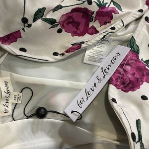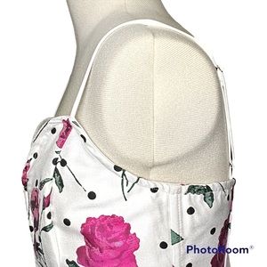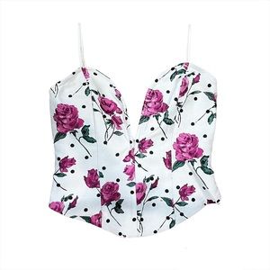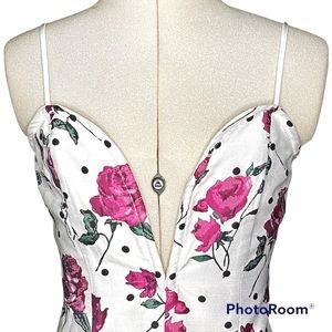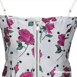 Features a plunging sweetheart neckline with center front V wire, adjustable cami straps, curved front hem, exposed back zipper and allover rose print.