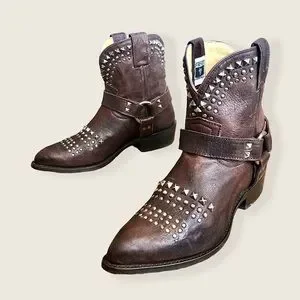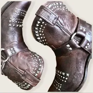 Frye Billy Biker Studded Brown Leather Harness Vintage Festival Moto Ankle Boots