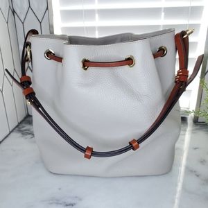 Dooney & Bourke kelly drawstring bag in light gray color. Featuring Gold-tone hardware, a red textile interior. Drawstring closure with two large tassels. pebbled leather exterior. 2 front slip pockets, 1 back zip pocket, 1 key clip. tan vachetta trim complete with a 10.5-in drop shoulder strap. make this bag your go to! in very good used condition, clean interior.