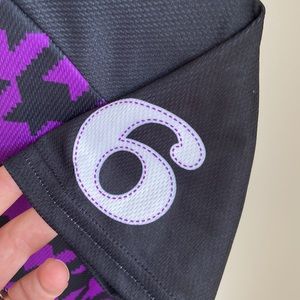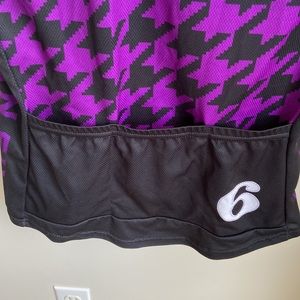 Twin Six biking shirt in cool black and purple design. 3 pockets in back. Zippered front. Lightly used. Make 6 your lucky number.