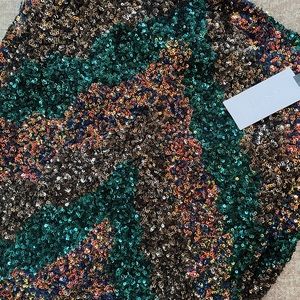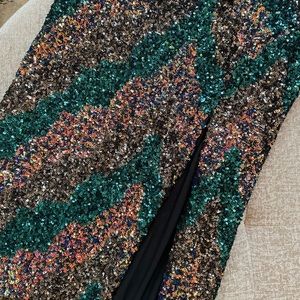 NWT, multi-colored sequined dress, never worn. Thigh high slight, lined, thicker weight. Chevron design with green, black and gold colored sequins. Cowl-neck with spaghetti straps.