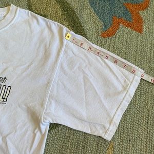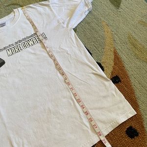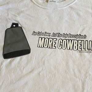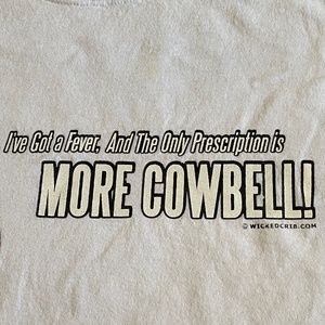 In VGUC, here is a Gildan heavyweight cotton tee with the classic line from SNL's "More Cowbell" skit of 2000. It was a spoof on VH-1's Behind the Music series about Blue Oyster Cult's (BOC) "Don't Fear the Reaper" song, particularly, its use of the cowbell. I still laugh when I think about it! This tee, unlike the others on PM, features the FULL quote, delivered to perfection by Christopher Walken. "I've got a fever. And the only prescription is MORE COWBELL!" Please see ***s below, and accompanying photo, for one spot/flaw.