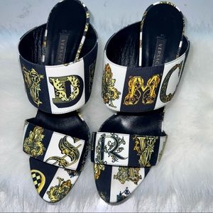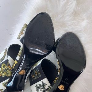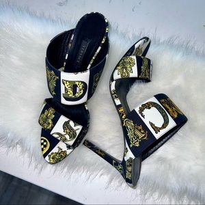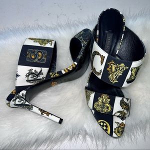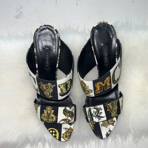 Authentic Versace Women's Baroque-Print Faille Mules - Styled with a leg-lengthening stiletto heel, Versace's double-band mules are crafted of black, white, and gold faille printed with the house's signature archival baroque motif. Showcasing one of the label's beloved prints, this piece