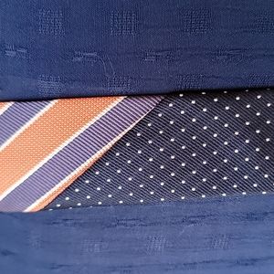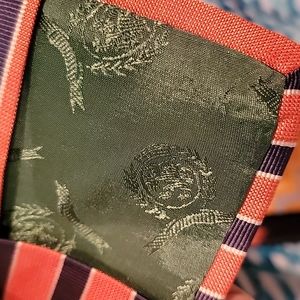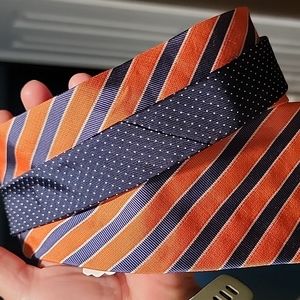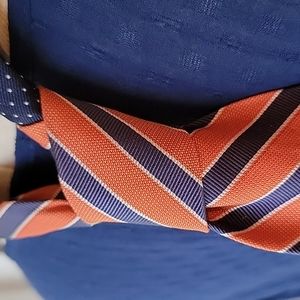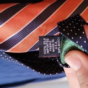 Classic Tommy tie with stripes and polka-dots. Navy field with white mini polka-dots, orange field with white-trimmed navy stripes, hunter green lining. Like new.