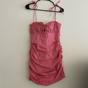 NEW WITH TAGS NEVER WORN White Fox Boutique “Not Too Far” Mini Dress. Coral color (looks more of a dusty rose color in person) ruched dress with corset fitted top of dress. Fitted sexy dress, tie/adjustable straps, tie at the bust of the dress, zipper closure on back. In brand new excellent condition with tags attached, never been worn except to try on; no flaws. Open to offers!