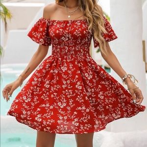 Boho Red Floral Print Off Drop Shoulder Smocked Waist Dress