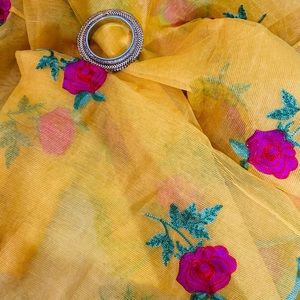 A yellow coloured kota doria dupatta with curved edges and beautiful rose design