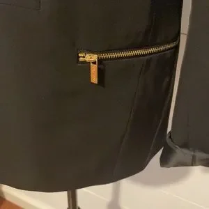Gold zippers at hip pockets.
