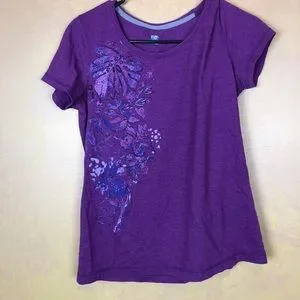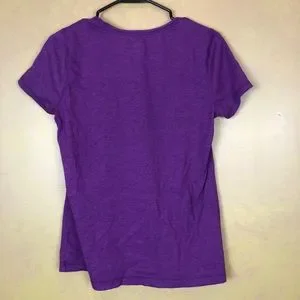 Woman’s blouse, size medium, short sleeves, round neck, purple t-shirt, 60% cotton, 40% polyester, 25 inches shoulder to waist, 181/2 inches pit to pit, #1124