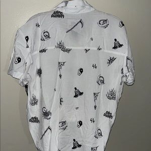 The Mixed short sleeve button up shirt from Lurking Class by Sketchy Tank comes in a white colorway with sublimated graphics throughout, like spiderwebs, grim reapers, and more. It has a turndown collar, straight bottom hemline, and a tie-front option, too, while its rayon construction makes the shirt flowy and lightweight.