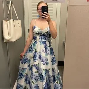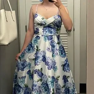 Floor length beautiful floral gown with built in cups. Perfect for a wedding or prom. Multiple layers but still very light. Has deep pockets you can put things into.