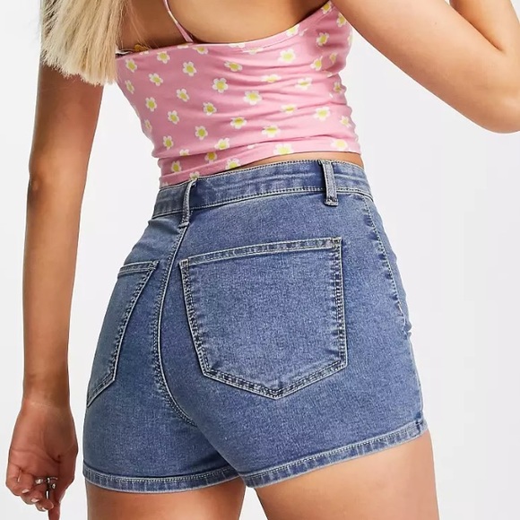 TopShop petite blue denim stretchy mini shorts, high waisted. In great condition. Size 4 petite but fits like a 000.