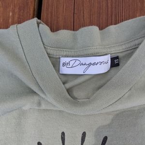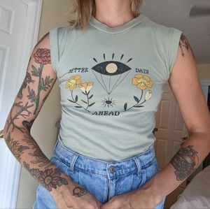 Girl Dangerous x Free People collab Better Daze Ahead tee-shirt. Unique intentionally distressed trippy graphic with third eye, sun and flowers. Muscle tee cut giving this top a unique edge. seafoam peridot green color. Size extra small. Excellent preloved condition - only worn once. 100% cotton.