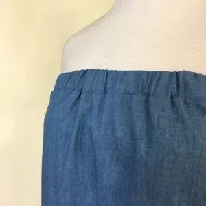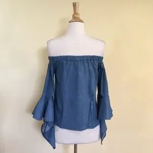 This cute, chambray top has long, ruffled bell sleeves, a trendy off shoulder cut. Flirty, comfortable, and versatile. Pairs well with jeans or a skirt and boots.