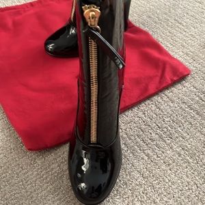 Valentino patent-leather ankle boots, Front zipper fastening, Gold-toned hardware, rounded toe, stitched panels, All leather, Heel height 4.75”, Made in Italy.
