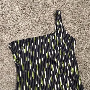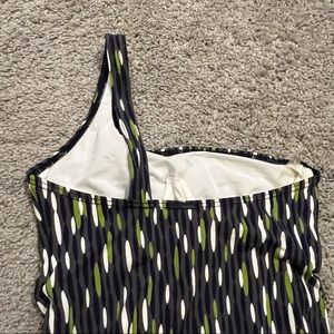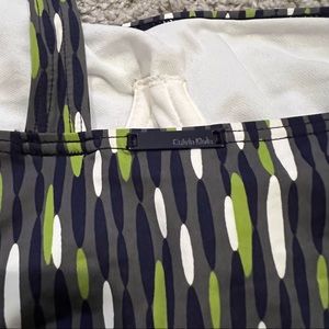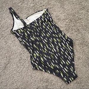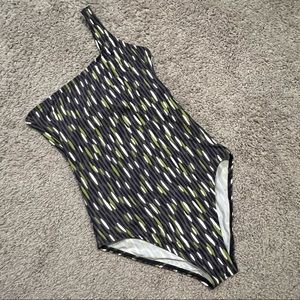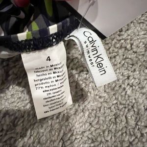 Calvin Klein Swimwear 1-Piece printed suit. Asymmetrical style with bone in chest area. Gorgeous print for slimmer look! Grey color with green, white and navy blue design. Make me an offer!