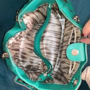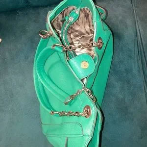 Large shoulder bag, gorgeous bright teal color, faux leather, fabric inside, excellent condition, chain on straps, lots of pockets and room