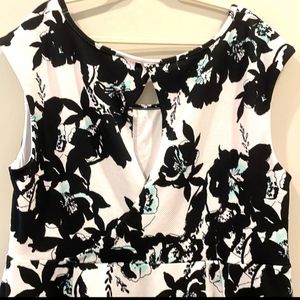 Beautiful black and white floral design with touches of blue scattered throughout. Textured material. Partially lined (bust).