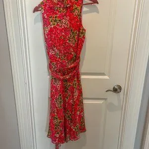 Pink and green floral summer wrap-around dress. Perfect for a garden party, summer outdoor wedding, etc. Size 12 but due to wrap-around can be worn by multiple sizes. I'm a size 10 and fit me fine; fully lined; smoke free home.