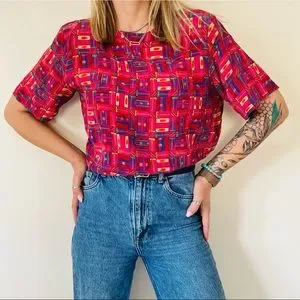 Vintage QUO-SILK Contrast abstract boho Top t-Shirt 100%silk