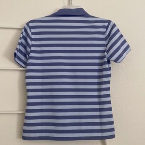 New Nike Golf Fit Dry Polo Shirt, in Stripes of blue and light gray colors. Actually it’s more of very pretty purplish blue, like on collar. And nice Nike swoosh metal buttons. Womens S (4-6).