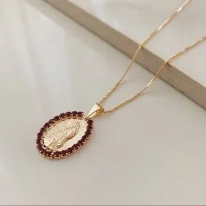 Gorgeous Virgin Mary necklace with garnet color crystal accent. The color is a rich deep burgundy. Dainty and delicate, wear alone or layered. Lobster claw clasp. High quality. New in gift box. Made by me with love. I handpick my materials locally here in New York.