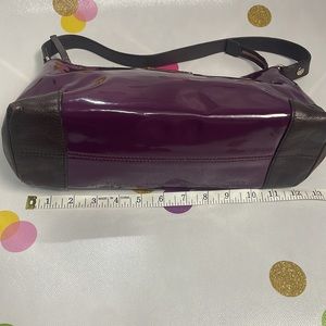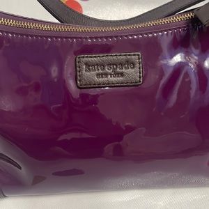Kate Spade bag. Patent leather purple with dark brown leather strap and trim. Bottom of bag shoes wear. Very good condition.