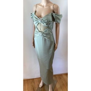 RASARIO off the shoulder neckline, cap sleeves, spaghetti straps, center back vent, back zip, polyester/spandex. Line thru inside label, dress was in a retail environment, has been handled & tried on. I found a run by the left chest area, I think I found one on the cap sleeves, but u can barely see that one. Paper is still on the Swarovski embellishments. Size FR 40/US 8. C 34” to 35” W 29.5” H 40” color is olive