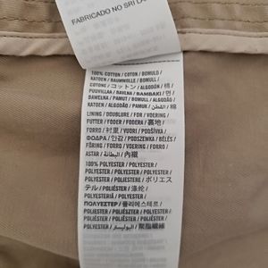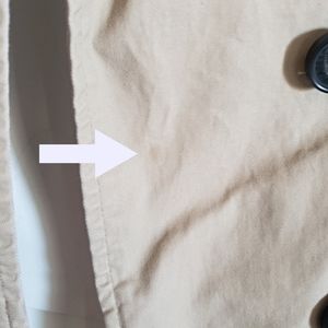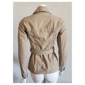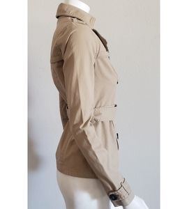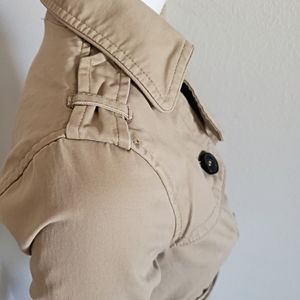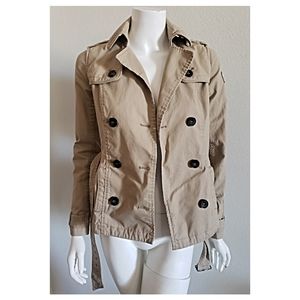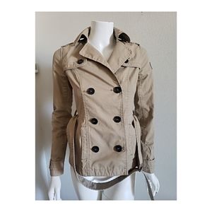 Flattering fit with double breasted buttons and belt. One tiny stain on front covered when buttoned.