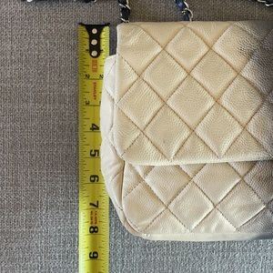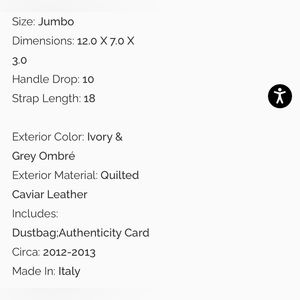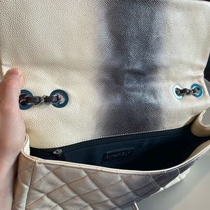 This Bag is made from off-white quilted caviar leather with a grey ombré stripe down the centre. The bag closes with the classic CC turnlock and has two chain intertwined straps. Carry this style with the strap doubled or pulled through for a longer drop. Retail price for a current Classic Jumbo Bag is 11k.