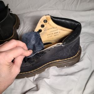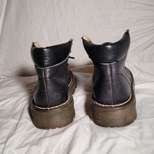 Vintage Dr Martens black leather boots. Has "Made in England " stamped on sole, so late 80s or early 90s. Very good shape for 30+ yr old boots, one owner, had great fun in these, very comfortable. Has unusual double stitching on toe, very hard to find on Google, rare! Some wear on heels of sole, very old. Great shape, no major defects, original laces.