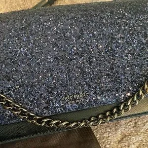 Beautiful, new with tags, dark blue sequin crossbody. Removable strap so it can be used as a clutch. Chain droops across the front is not removable. Magnetic snap closure. Perfect size to hold a small wallet and cell phone. Comes with dust bag.