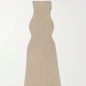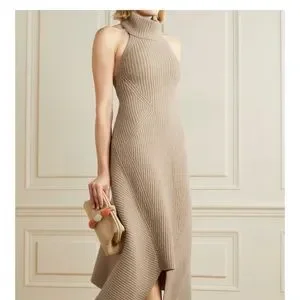 Cult Gaia's 'Akiko' dress is knitted with generous amounts of wool and alpaca for a warm, cozy handle. Strategically ribbed to create an hourglass effect, it has a slouchy halterneck and turns to an open back. The asymmetric hem is perfect for showing off a pair of fun sandals.