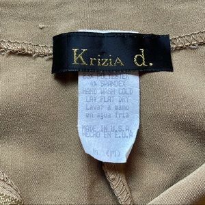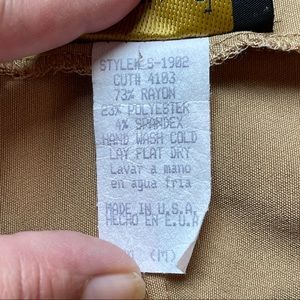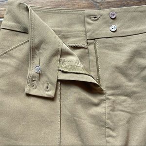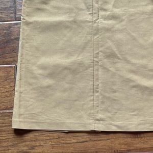 Tan slim pencil skirt. Falls about knee length. 2 outer buttons and 1 hidden button and zipper closure. Small slit up the middle at the bottom hem.