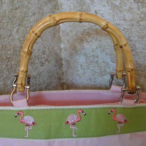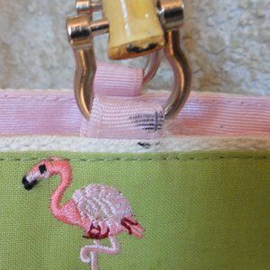 This bag is a cotton candy pink grosgrain type fabric with the lime green flamingo trim across the top and a cute lime green tassel. It's about 11" x 9" x 5" and has metal feet to keep the bottom clean. There are double bamboo handles and the top zips to close. The interior is lined in lime green with pink trim on the 2 slip in pockets. There is also a zip close pocket. The bag is vintage but NEW, never used. Somehow, it did get a small stain on the back handle that got onto the purse slightly - shown in last picture. I did not try to clean it ... it may come off, but pictured for clarity. Also, on the back, 2nd to last pic, there is one very small, faint line which I'm noting although it is difficult to see. That's the scoop on this otherwise perfect bag!!!