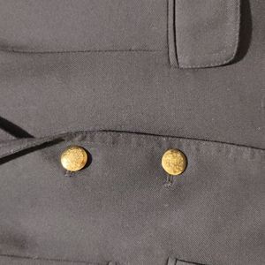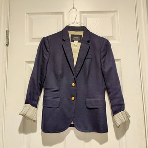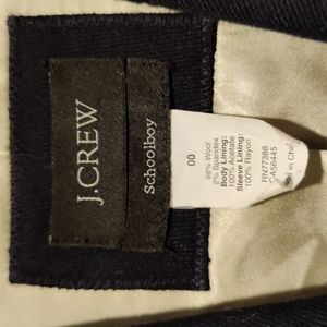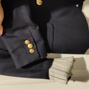jcrew navy 00 schoolboy blazer. gold buttons, pockets non functional. sleeves can be rolled to show inner lining of white stripes, or kept down to show the 3 gold buttons on sleeve (see photo).