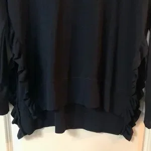 A cross between a long sleeve crew neck and a sweatshirt, this top is a lightweight material and is very soft to the touch. The sides have a split with a ruffle accent elevating a classic and adding comfort. Runs a little small, wears more like a medium than a large.