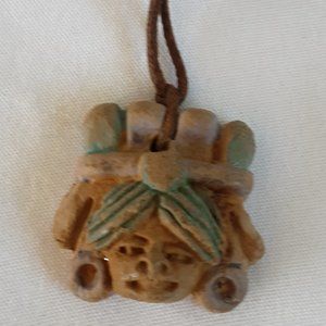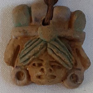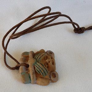 Pottery Aztec Head Bust Necklace Vintage Handcrafted Leather Knotted Cord