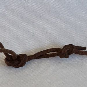 Brown leather knotted cord, tied in 2 knots at back. I can replace this with a brand new adjustable black cord, I've included photos. I will send you the leather one with it.