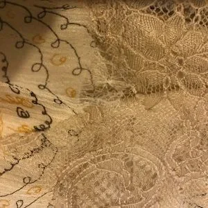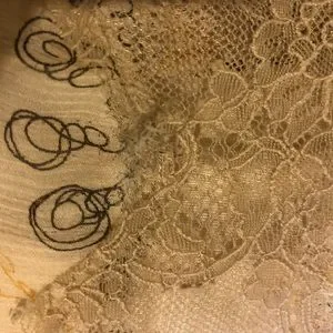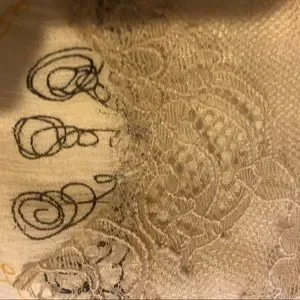 Used and in poor condition. The last several photos show to the best of my ability how the lace trim inserts have pulled away from the silk in many areas; they are several more I couldn’t include in the listing due to photo limits. It could be a beautiful piece once again with some detailed repairs, or the beautiful fabric could be repurposed.