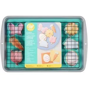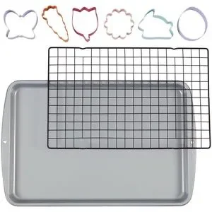 • Includes 11.5 x 17.2 in. cookie sheet, 10 x 16 in. cooling grid, 6 metal cutters (butterfly, carrot, daisy, egg, tulip, bunny)