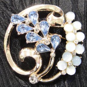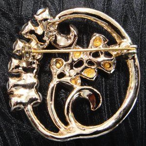 This is an unusual and beautiful circle pin that has been in our family for many years. It's a fairly heavy piece at about 27 grams but has no markings I could find. The jewels all look to be top notch and in wonderful shape. Likely from the 1950's, it has been carefully stored for many years but deserves to be worn again! It's about 1 3/4" in circumference with gold tone metal.