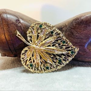 Be gorgeous in gold and green! This vtg. Leaf brooch features 7 sparkly green rhinestones and is 2-1/4” wide and 1-5/8” tall. The pin is not marked or signed.