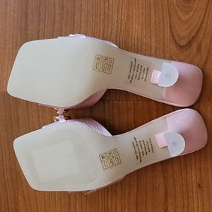This glamorous slide sandal in lustrous satin gets extra flair from a super-chunky curb chain and glossy, sculptural heel.