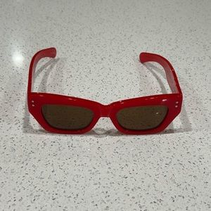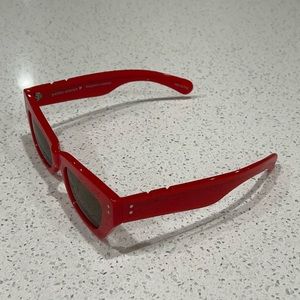 Red handmade acetate frame and arms, silver rivet detailing, hinge & printing. Solid brown CR39 lenses. Category 3 protection. OBE Germany dipped screws.