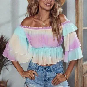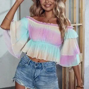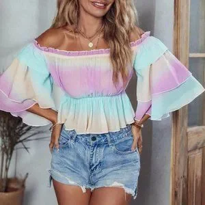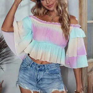 Off Shoulder Frill Trim Layered Sleeve Peplum Crop Ombre Blouse