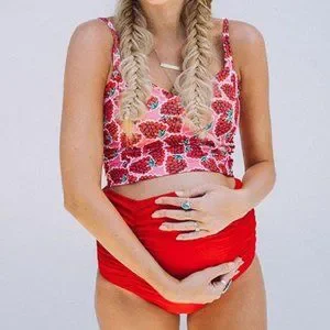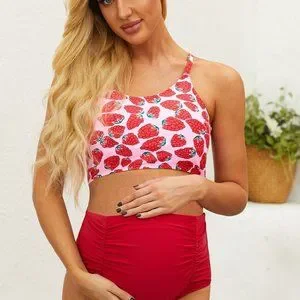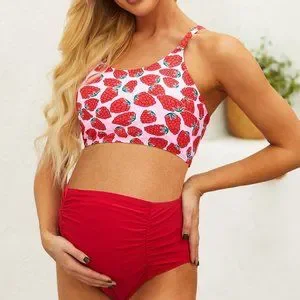 - Adorable 2 piece swim suit. Pink top with raspberries, over the head style (no hooks or ties). Slight crop top style with a slightly padded bra & a pretty strappy back. Solid red high waisted bottoms with ruching on the sides for a growing belly.