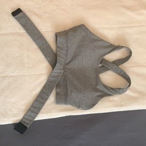 Grey sports bra crosses on stomach. Very flattering. Only worn a number of times. Very good condition.