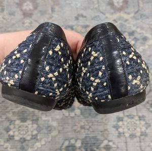 upper of raffia, edged and lined in leather. The cushioned leather footbed has built in arch support, providing stability and comfort.