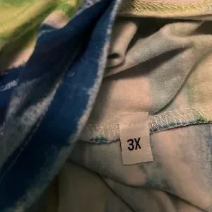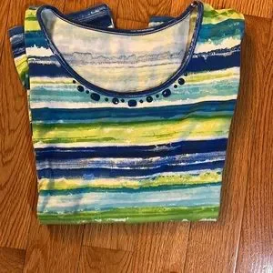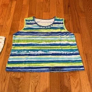 —Second Top is gently worn but in excellent condition. It has some shades of blues and greens in various stripes. It also has some blue beads across the neckline. It is a tank top. Also it does not have a name brand. The two tops are about the same size 👚👚👚it also has some stretch to it.